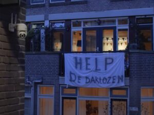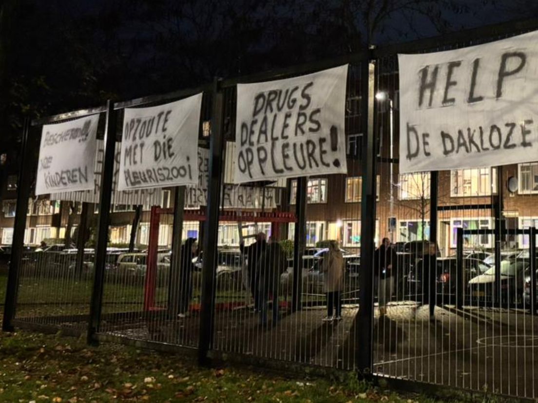 De afgelopen weken doken er tientallen spandoeken op in de Museumstraat met teksten als ‘Dealers oppleure!’, ‘Red ons Rotterdam’ en ‘Help de daklozen’. Gerard legt uit dat het niet alleen om drugsgebruik gaat: “Ze hebben ook seks in de portiek.”