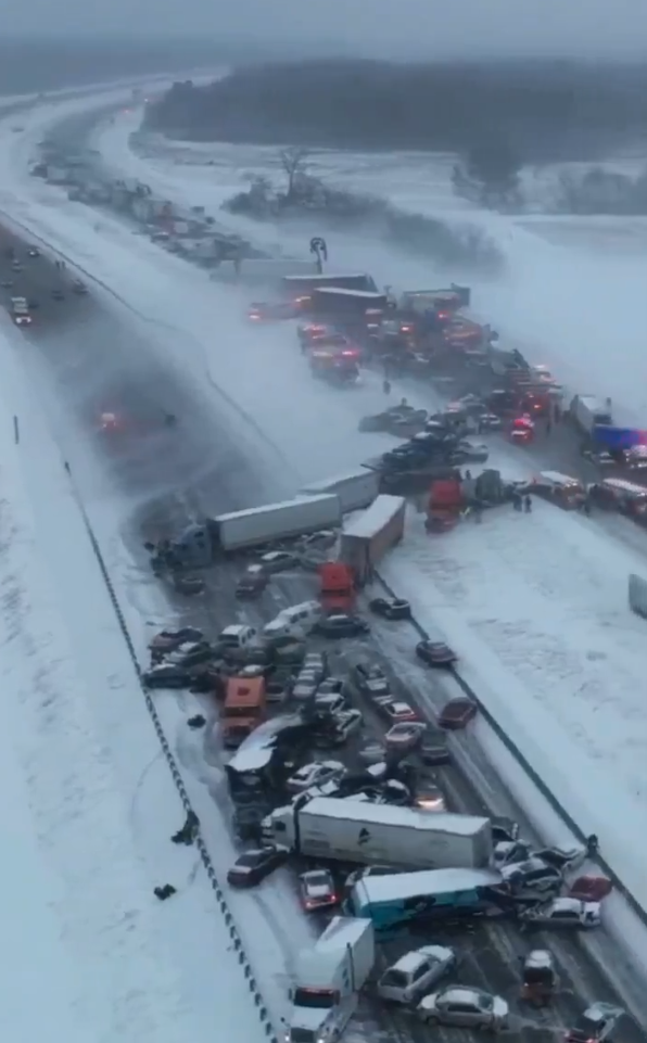 De kettingbotsing ontstond rond het middaguur, op een moment dat een plotselinge sneeuwwolk het zicht op de weg volledig wegnam. Weggebruikers werden verrast door zware sneeuwval, windstoten en zogeheten “white-out”-omstandigheden, waarbij bestuurders nauwelijks enkele meters vooruit konden kijken. Tegelijkertijd vormde zich op het asfalt een laag zwarte ijs, waardoor voertuigen massaal grip verloren en achteropkomend verkeer niet meer in staat was op tijd te remmen. Binnen enkele minuten botsten tientallen voertuigen op elkaar, waarbij sommige voertuigen tegen vangrails werden geduwd en meerdere vrachtwagens dwars over de weg kwamen te staan.