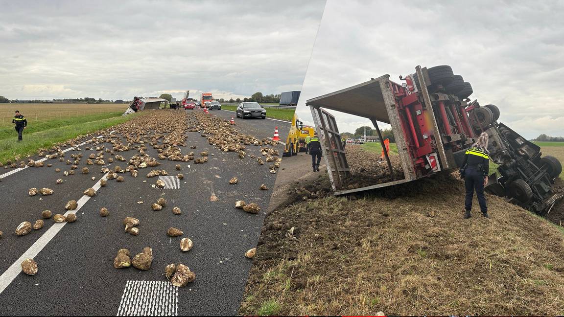 De vrachtwagen is door nog onbekende oorzaak van de weg geraakt en in de sloot terechtgekomen. Een deel van de lading suikerbieten ligt verspreid over de rechterrijstrook, die daarom is afgesloten. De linkerbaan blijft vooralsnog open, waardoor het verkeer langzaam kan passeren.