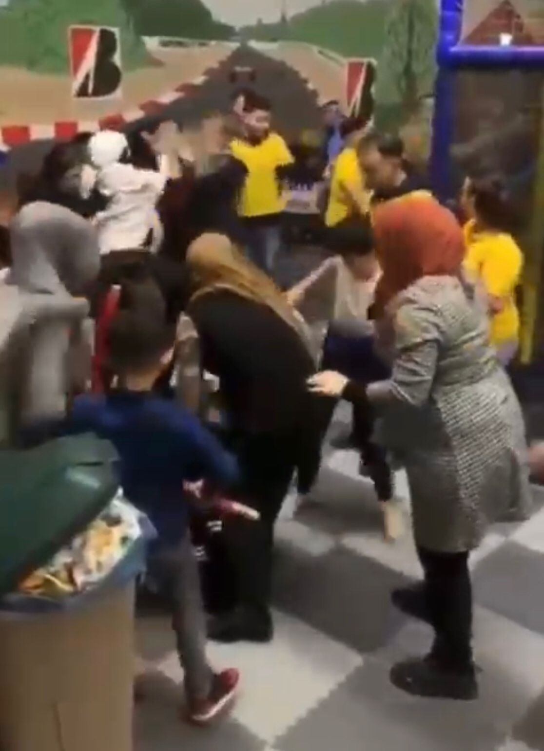 Bezoekers proberen kinderen weg te trekken terwijl de vechtpartij zich door het speelgedeelte verplaatst. Een medewerker die de groep tot rust probeert te manen, wordt eveneens belaagd.