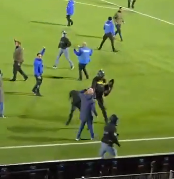 De wedstrijdleiding besloot in overleg met de clubofficials en de veiligheidsinstanties om het duel niet te hervatten. Volgens ooggetuigen werd de rust al snel onmogelijk: supporters van beide kanten zochten systematisch de confrontatie en er werd massaal vernield. De inzet van de Mobiele Eenheid (ME) werd noodzakelijk om de situatie onder controle te krijgen, maar het incident onderstreepte dat de veiligheid niet voldoende kon worden gewaarborgd. Een steward raakte gewond en ook meerdere politieagenten werden bij het incident betrokken.