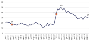 De PVV van Geert Wilders blijft al sinds maart dit jaar stabiel rond de dertig zetels. In de nieuwe peiling komt de partij uit op 31 zetels, zes minder dan bij de verkiezingen van november 2023, maar nog altijd ruimschoots de grootste.