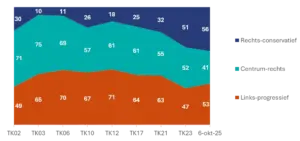 Het links-progressieve blok (GroenLinks-PvdA, D66, Volt, SP, PvdD, DENK, BIJ1) telt in deze peiling 53 zetels (35 procent). Dat is een lichte stijging ten opzichte van 2023, maar volgens de onderzoekers slechts een “bescheiden herstel” na wat eerder werd genoemd “het meest rechtse kabinet ooit”.