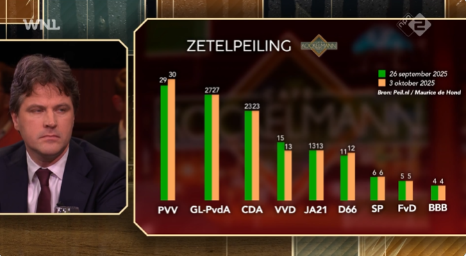 Den Haag – De PVV van Geert Wilders blijft volgens de nieuwste peiling van Maurice de Hond de grootste partij van Nederland. Als er nu verkiezingen zouden zijn, zou de partij 30 zetels behalen, zo maakte De Hond vrijdagavond bekend in het programma Café Kockelmann op NPO 2.