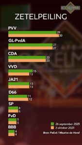 CDA-leider Bontenbal waarschuwt ondertussen dat een sterke PVV de kabinetsvorming ingewikkelder maakt. “Een groot PVV-resultaat maakt een stabiel kabinet moeilijker. Wij sluiten samenwerking met de PVV uit – en de VVD heeft dat ook gezegd,” benadrukte hij. “Wie op de PVV stemt, maakt de kans op een stabiel kabinet kleiner. Maar het kan nog alle kanten op.”