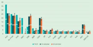 DEN HAAG – In de laatste zetelpeiling voor de verkiezingen maakt D66 een opvallende sprong. De partij van Rob Jetten stijgt met acht zetels naar 24, terwijl de PVV van Geert Wilders vijf zetels verliest en uitkomt op 29. Dat blijkt uit de slotpeiling van EenVandaag en onderzoeksbureau Verian.