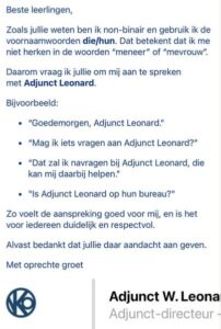 Op middelbare school VKO Opwijk in Vlaams-Brabant is die spanning de afgelopen weken scherp naar boven gekomen. Daar heeft de nieuwe adjunct-directeur zich bij aanvang van het schooljaar openlijk als non-binair voorgesteld. In een mail aan leerlingen, ouders en collega’s legde die uit zich niet thuis te voelen in de klassieke aanspreektitels “meneer” of “mevrouw”, en vroeg om neutrale taal te gebruiken. De adjunct-directeur gaf daarbij aan de voornaamwoorden “die/hun” te gebruiken en stelde voor om simpelweg “adjunct” als aanspreekvorm te hanteren, bijvoorbeeld: “Goedemorgen, adjunct”.