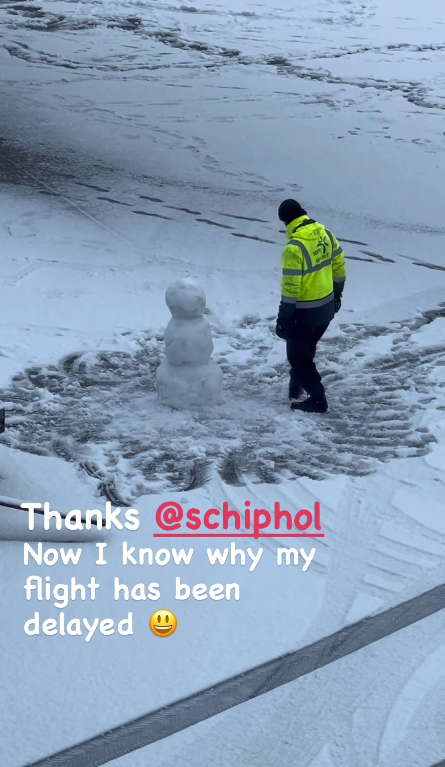 Juist op zo’n moment, waarin de spanning bij reizigers en personeel voelbaar is, dook er een video op die het internet wist te raken. Te zien is hoe een medewerker van de luchthaven, midden op het besneeuwde terrein, even de tijd neemt om iets totaal onverwachts te doen: hij maakt een sneeuwpop. Geen haast, geen stress, maar een kort moment van speelsheid in een verder hectische werkomgeving.