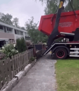 Wat begon als een gewone containerhuur voor sloopafval is geëindigd in een opmerkelijk en spraakmakend tafereel. Een afvalverwerker heeft maandagmiddag met een vrachtwagen de volledige lading puin teruggestort in de voortuin van een klant die na herhaaldelijke verzoeken weigerde te betalen. Omwonenden keken verbaasd toe terwijl de container werd gelost en het puin — bakstenen, tegels en gipsplaten — hoorbaar op de oprit en in de tuin belandde.