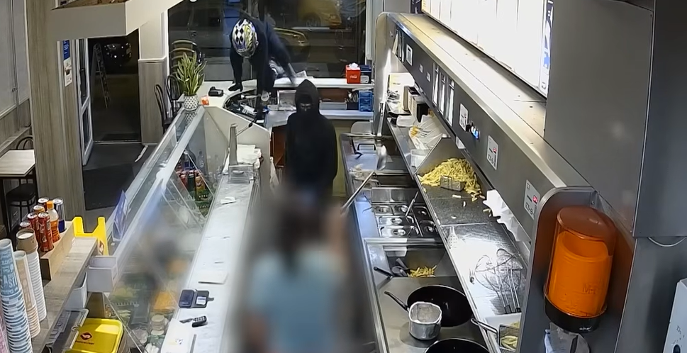 Twee vermoedelijk jonge mannen betraden de snackbar en grepen direct hun kans. Eén van hen sprong over de toonbank, terwijl de ander bovenop de toonbank klom en probeerde de kassa open te krijgen. Het slachtoffer, zichtbaar geschrokken door de plotselinge aanval, reageerde razendsnel.