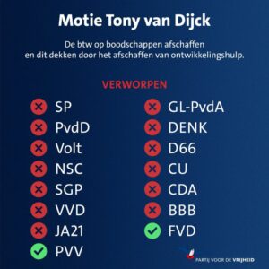 De motie van Tony van Dijck beoogde een directe verlichting van de kosten voor huishoudens. Door de btw op levensmiddelen te schrappen, zouden boodschappen fors goedkoper worden. Volgens Van Dijck kan dit volledig worden betaald door de miljarden die Nederland jaarlijks uitgeeft aan ontwikkelingssamenwerking te schrappen.