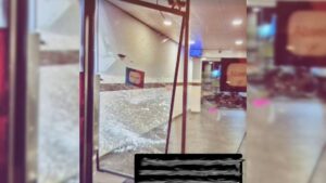 Niet veel later keerde de man echter in woedende toestand terug. Hij sloeg de glazen schuifdeur van de entree kapot. De deur was volledig gebarsten en hing nog maar net in het kozijn. Door het slaan liep de man snijwonden op aan zijn handen, waardoor er bloed op de grond terechtkwam.